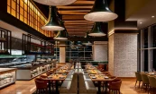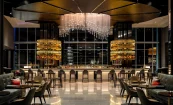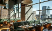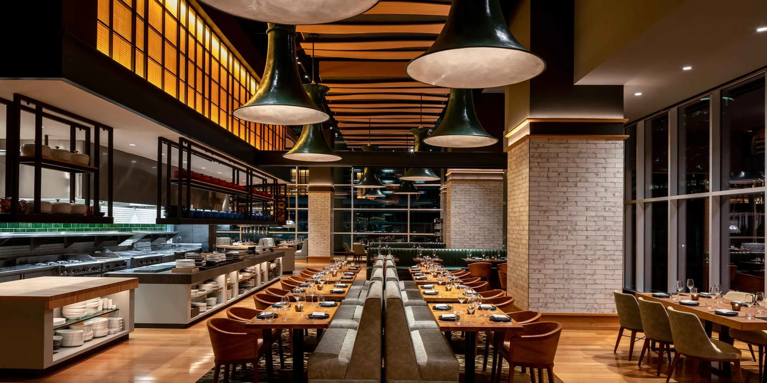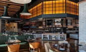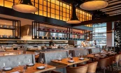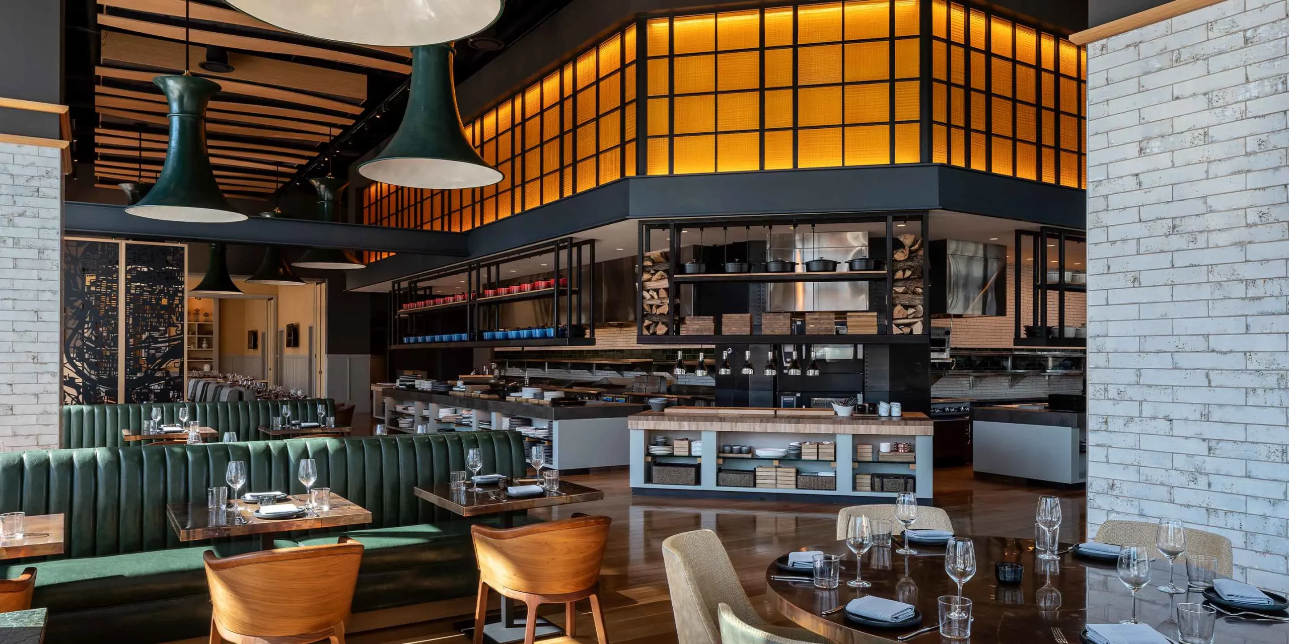 Inside, the rustic elegant style features sage banquettes and lighting, iron accents, and warm wood tables. Mirror and wood columns reflect the back-lit liquor bottles sitting on the floating shelves, while an impressive glass chandelier highlights the bar below. The open concept promotes direct views into the kitchen and of the Kansas City skyline. Outside, there is a wraparound terrace and bar area, with fire pits and biophilia adding a cozy richness to the space. Two distinctive private rooms are available for larger groups.