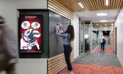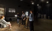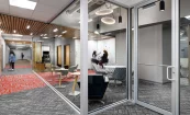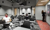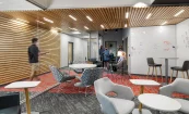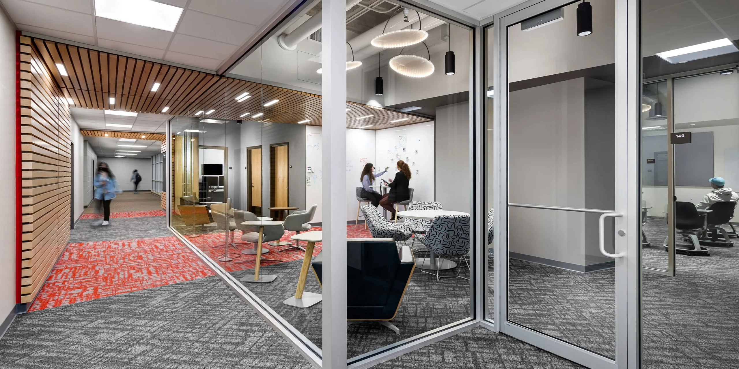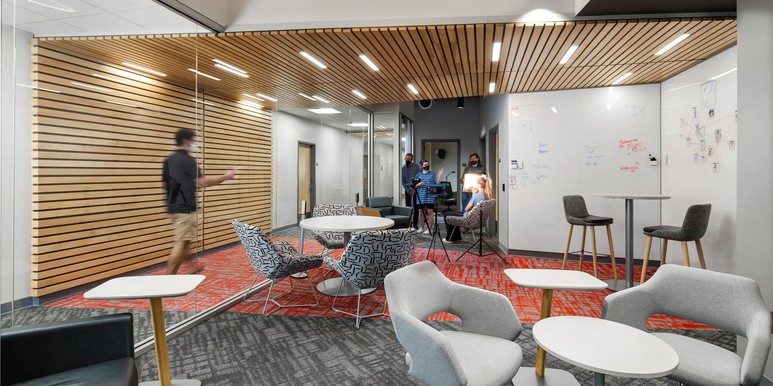 The program works in partnership with mainstream studios in the area. Social and screening events can be held in the large studio, outfitted with 4k video and surround sound, to showcase student work and offer networking opportunities. Inspired by the perspective from a camera lens, the design includes wood cladding and vibrant red carpeting to tie the spaces together and which, combined with a lounge visible from the corridor through full-height glazing, give the program a distinct presence. The facility is now primed to train the next generation of storytellers and makers.