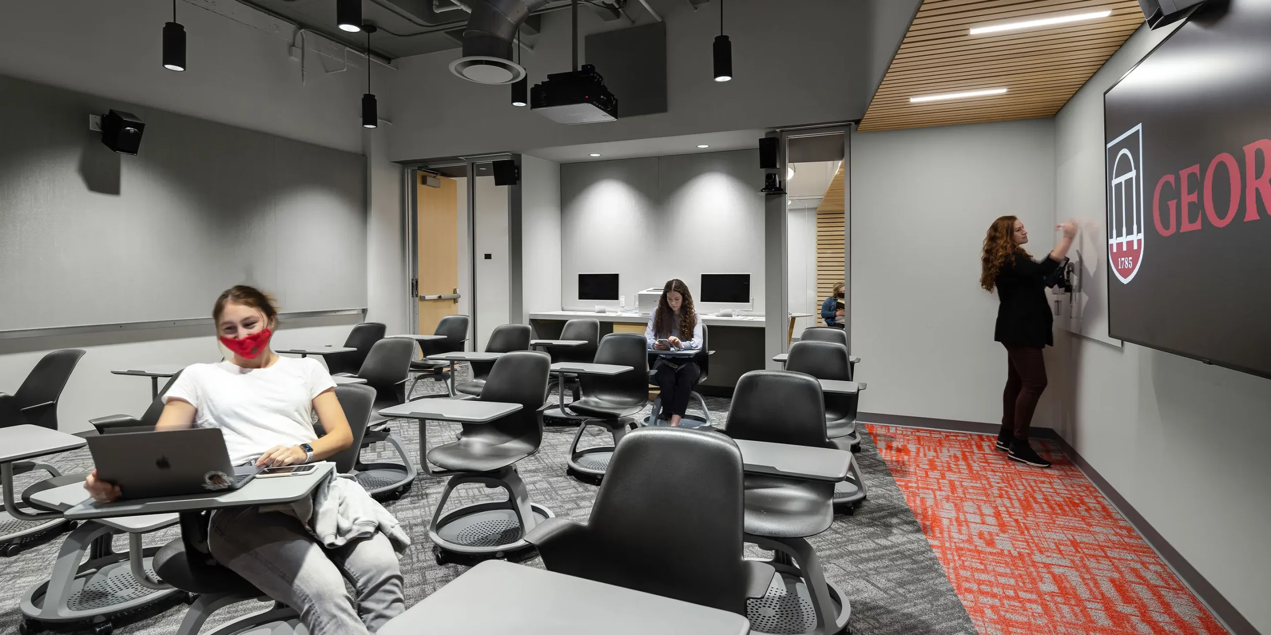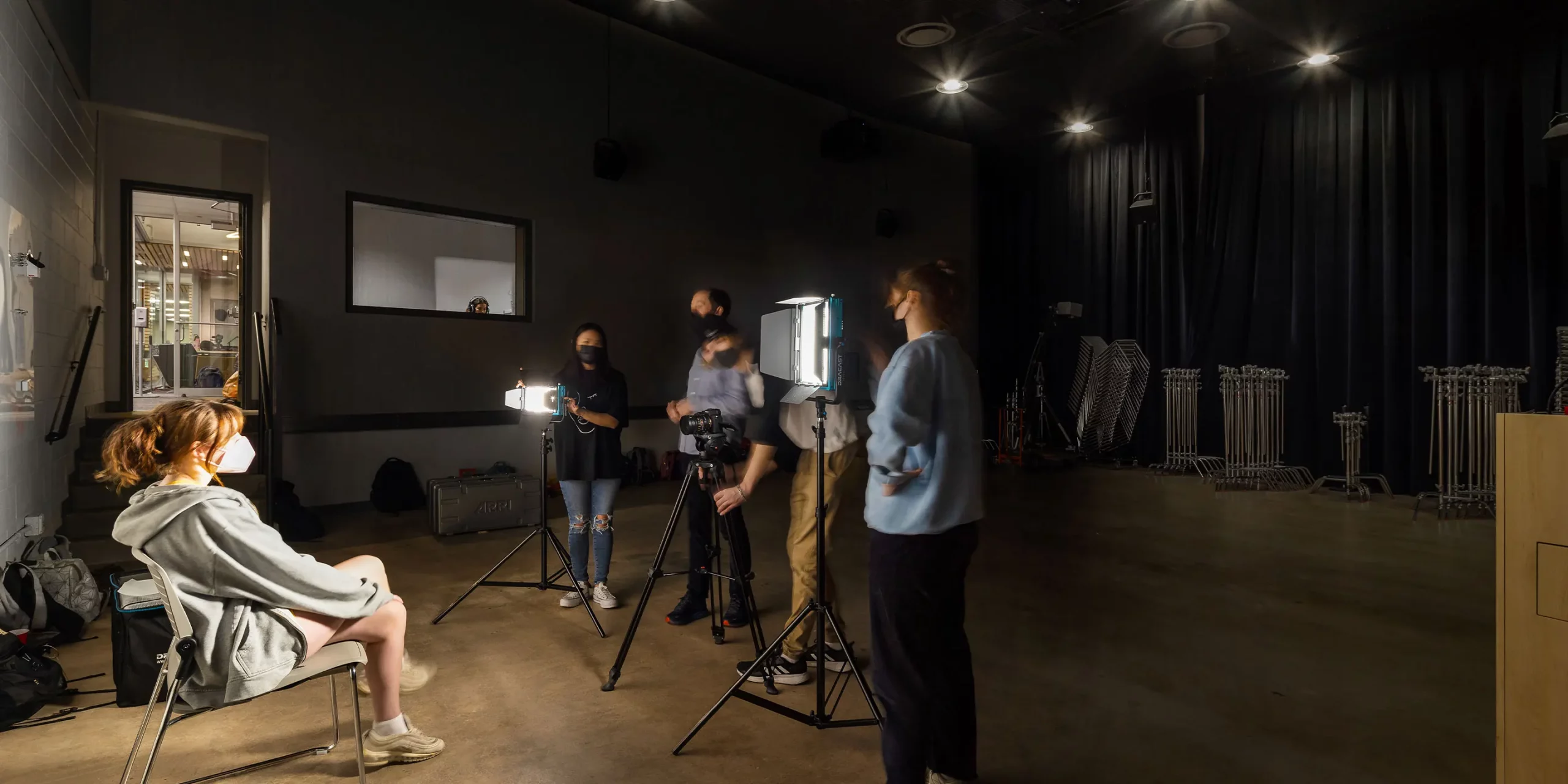 During the renovation, our team reconfigured the floor plan and added enough power, data bandwidth, screens, speakers, and acoustical treatments to ensure that all students have facilities suitable to hone their abilities. Spaces for chance encounters, impromptu meetings, and testing different approaches for lighting and filming were also key to develop the variety of the skills these graduates will need to work in the field.