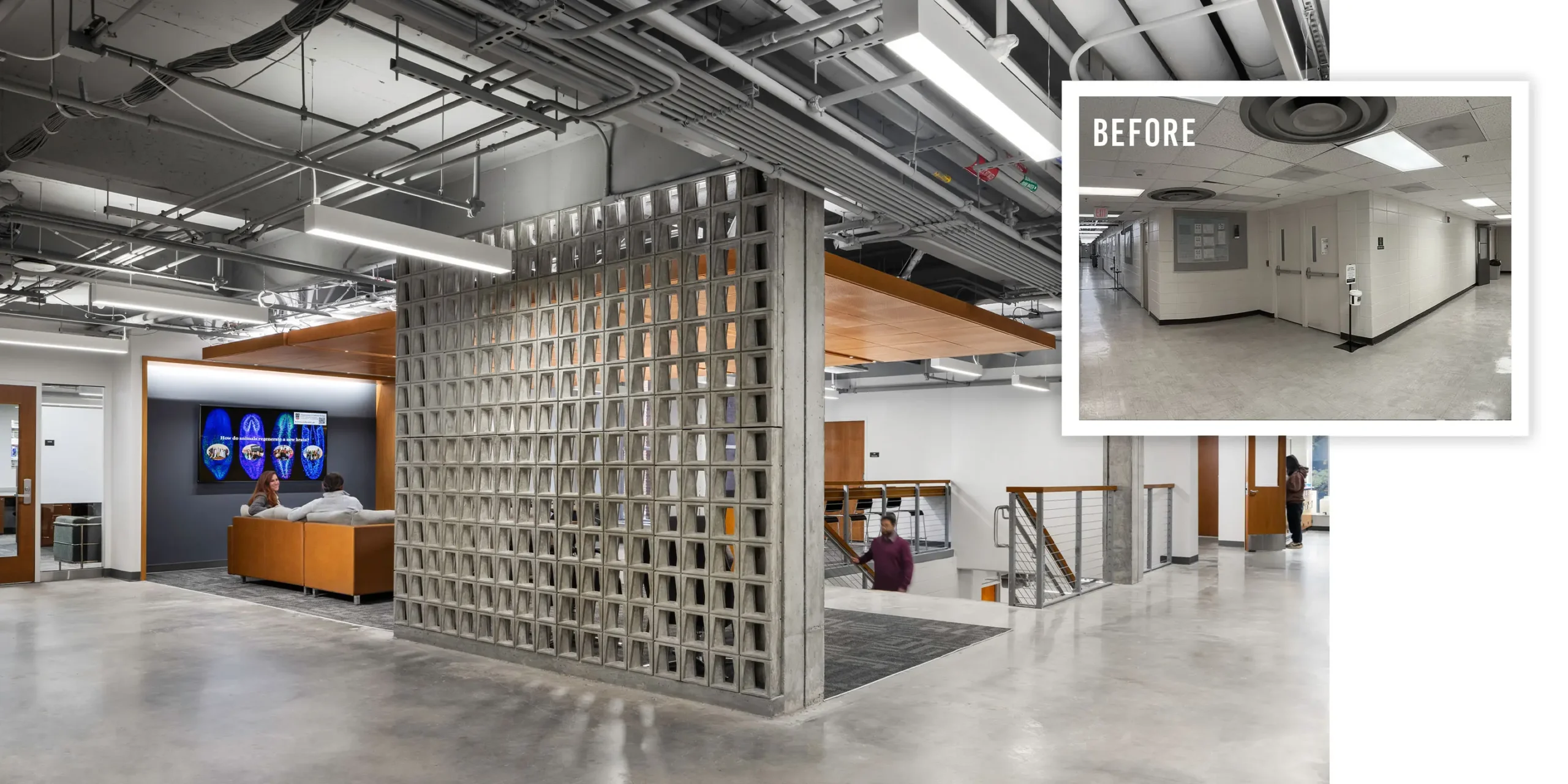 With just 11 feet between floors—far less than the standard height for new lab buildings—our team applied creative engineering to overcome complex MEP challenges. A centralized rooftop mechanical system and chilled beam HVAC technology preserved ceiling heights while improving energy efficiency. Additional upgrades included an encapsulated crawlspace, high-performance insulation, and energy recovery systems—together estimated to cut energy use by 10% annually compared to a ground-up lab.
