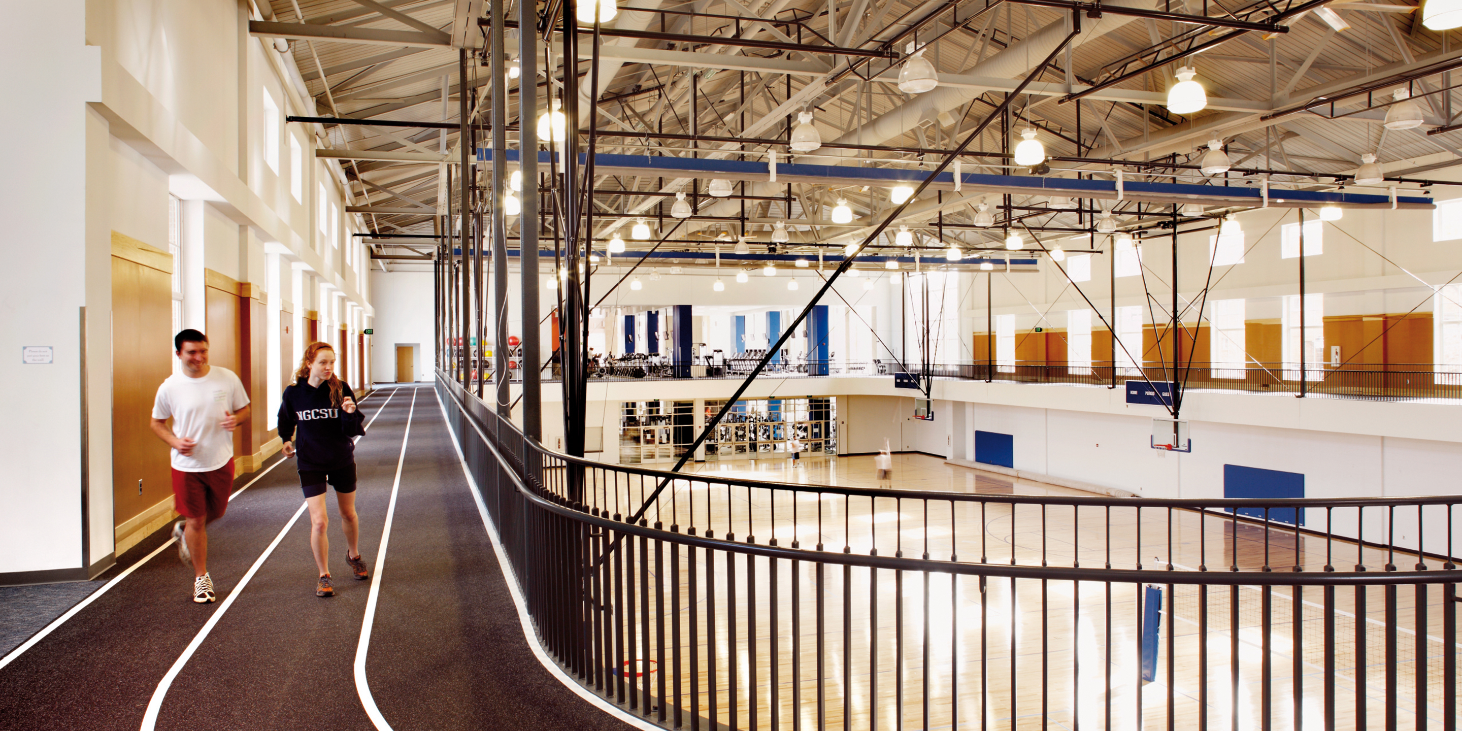 The University of North Georgia Student Recreation Center and parking deck includes a 58,000-SF building over a 600-space parking deck. Program elements include three regulation size basketball courts, fitness and free weight areas, a 35’ climbing wall, 1/10 mile running track, aerobic spaces, offices, and locker rooms. The project gives the growing student population the opportunity to exercise individually and participate in intramural sports. In addition, there is a central entry plaza connecting this facility to the central campus and adjacent town. The recreation center tower is an iconic focal point for the campus. The overall project served as a catalyst in connecting campus facilities, open spaces and student interactions.