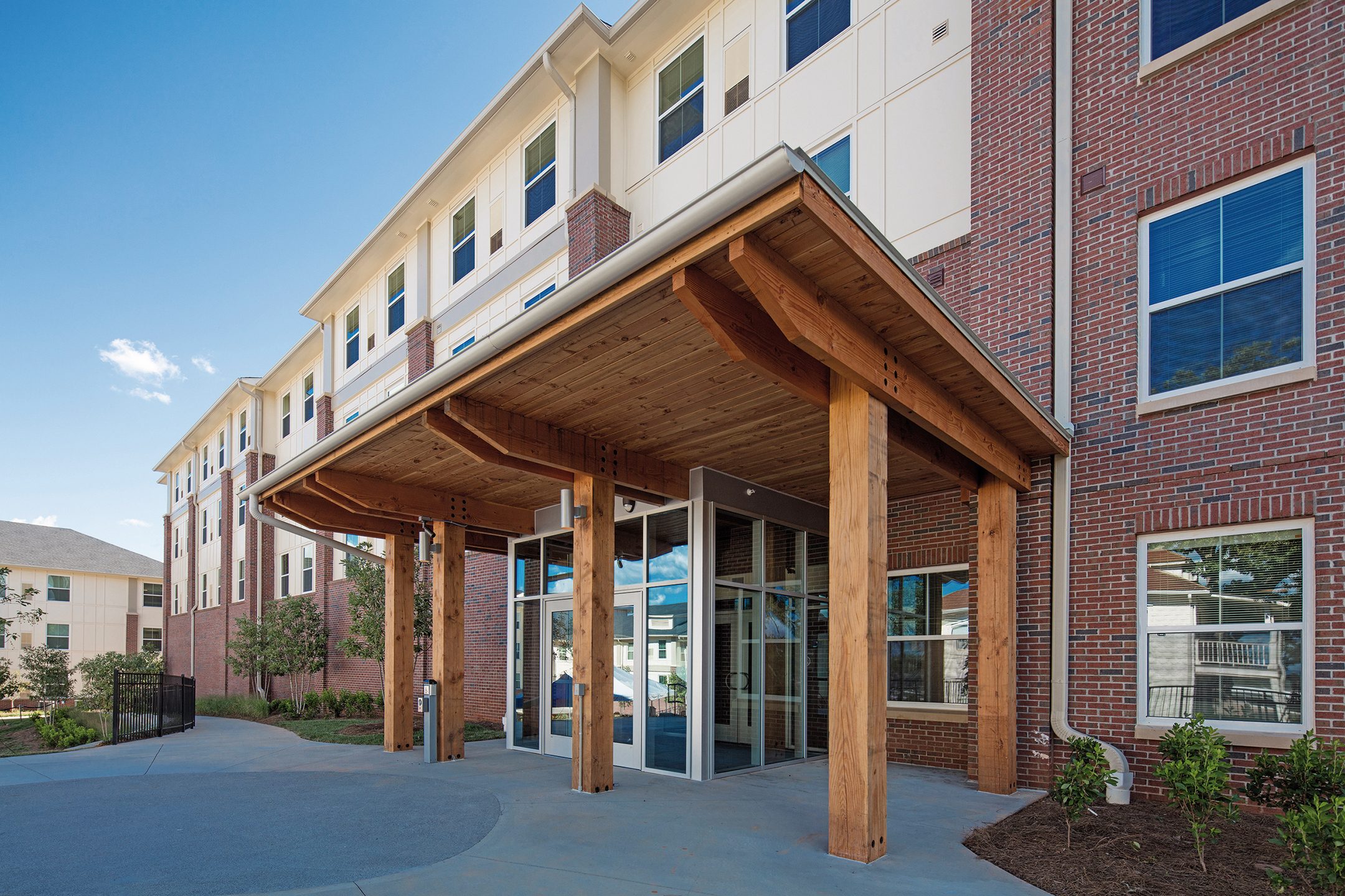 The University of North Georgia Student Residences project includes 536 beds in 114,000 SF within two buildings that form a central shared courtyard. The eastern building is four floors and the western building is five floors. The ground floor of the east building includes amenities and support spaces. Student residences occupy floors 2 thru 4 of the east building and all five floors of the west building. The room types included in the project are primarily two-bedroom shared suites (four beds per unit) and some two-bedroom suites (two beds per unit). There are also RA apartments on each floor and a RD apartment on the lower floor. Student lounges, study rooms, kitchens, and laundry rooms are strategically located on each residential floor.