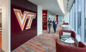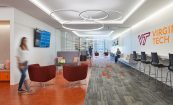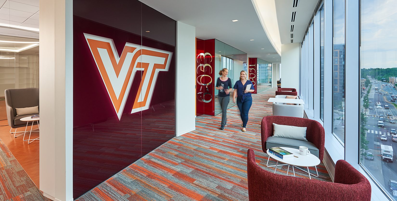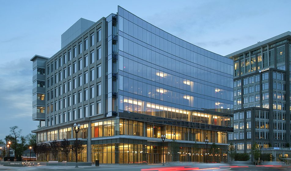 At the Virginia Tech Research Center Foundation (900 N. Glebe Road), the client’s programmatic goals were to generate a highly visible, state of-the-art facility offering great opportunity for partnerships with corporate research entities and government agencies. 800 N. Glebe Road is a 10-story, trophy, mixed-use office building with 316,677 SF of Class A office space and 535 below-grade parking spaces. A sweeping 10-story curtainwall façade made of three glass “sails” accentuates the amazing sight lines down the primary arteries of N. Glebe Road and Wilson Boulevard in the Ballston neighborhood of Arlington, VA. This project achieved LEED Gold certification.