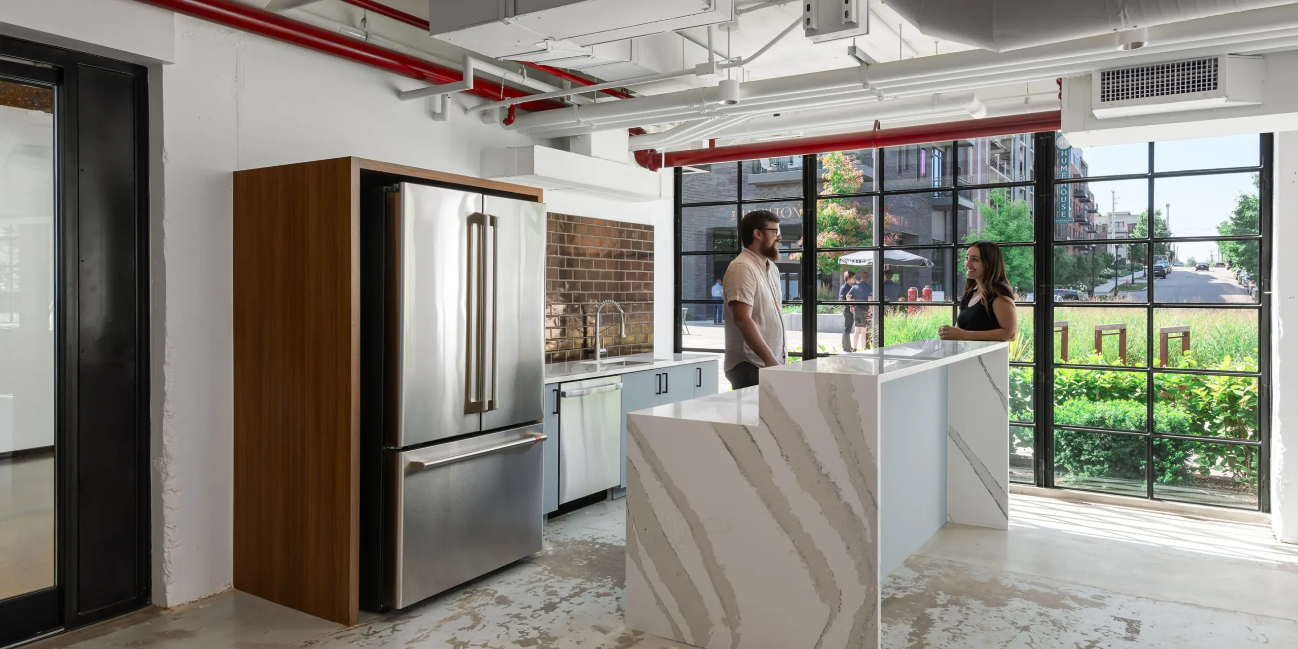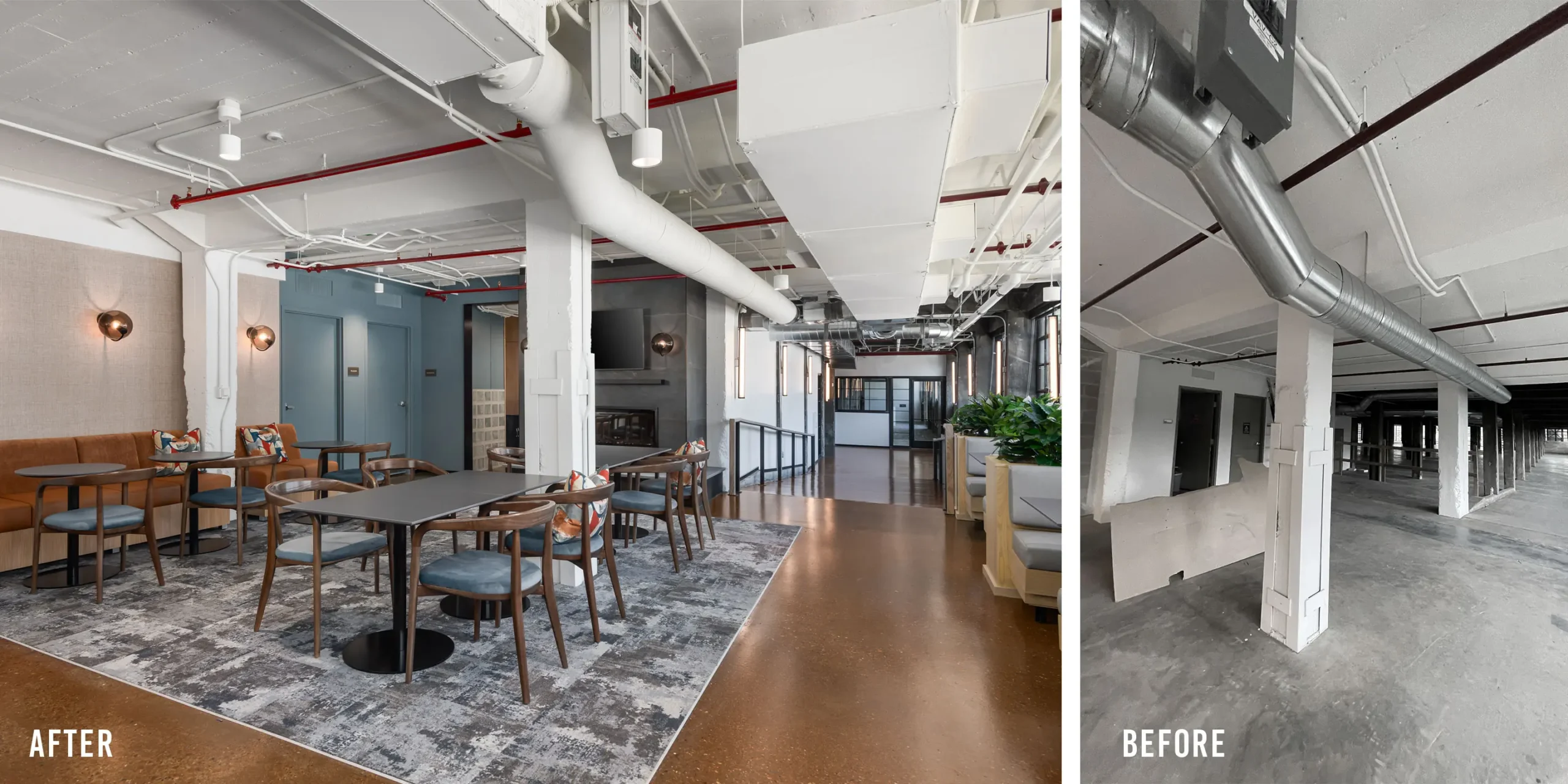 Cooper Carry transformed the warehouse into nine suites that complemented the building's character and were ready for immediate occupancy. The renovated building now includes a training room, common lounge, and micro-market for shared use by tenants, repurposing underutilized areas into inviting amenities.