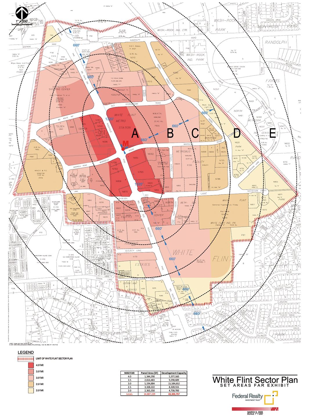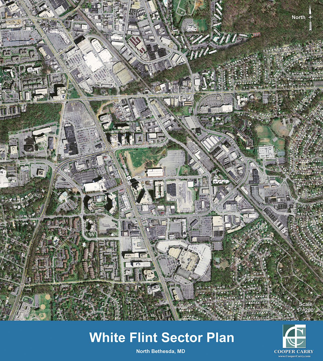 During the Montgomery County White Flint Sector Plan process, Cooper Carry worked with a consortium of developers and with Maryland National Park and Planning Commission, looking to guide consensus on density and urban design within the area’s boundaries. Cooper Carry developed FAR and height diagrams to match the county’s vision for mixed-use, dense community in the future in order to guide area-wide rezoning. Height and density cluster around the metro station exits and Rockville Pike in an oval, reflecting the transit nodes and infill road connections to these nodes. This layout physically illustrates the importance of the Rockville Pike corridor that connects the neighborhood to downtown DC, while respecting the single family residential neighborhoods surrounding the central core. Cooper Carry also master planned two sites within the sector for different developers.
